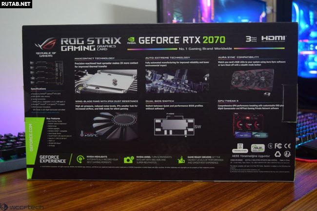 Упаковка уделяет большое внимание стороне RTX, поскольку первая функция, включенная в AIB, будет Ray Tracing, за которой следуют GDDR6, DirectX 12 и поддержка Ansel. NVIDIA сделала ставку на поддержку Ray Tracing, поскольку они являются первыми картами, поддерживающими эту новую функцию. Вы также можете отметить конкретный вариант этой видеокарты на передней панели, OC (Overclock) в нашем случае. ROG STRIX 2070 доступен в стандартном, OC и расширенном вариантах, и на коробке четко указано, какой вариант вы получаете.