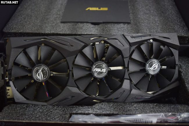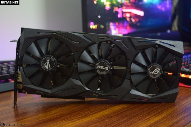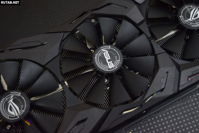 С точки зрения дизайна, мы рассматриваем великолепный, полностью матовый черный саван, который имеет уникальный и очень брутальный дизайн. Карта имеет три вентилятора спереди, каждый из которых диаметром 90 мм и оснащен запатентованным дизайном ASUS Wing Blade, который предлагает давление воздуха на 105% выше и работает в 3 раза тише, чем эталонные карты.