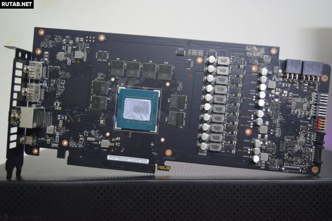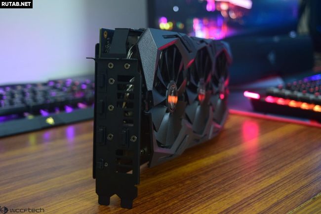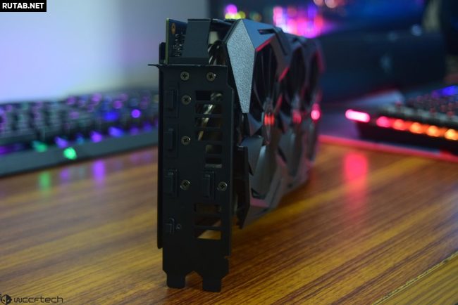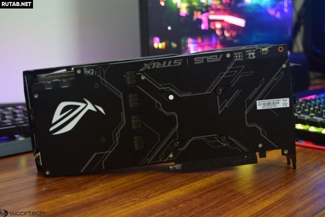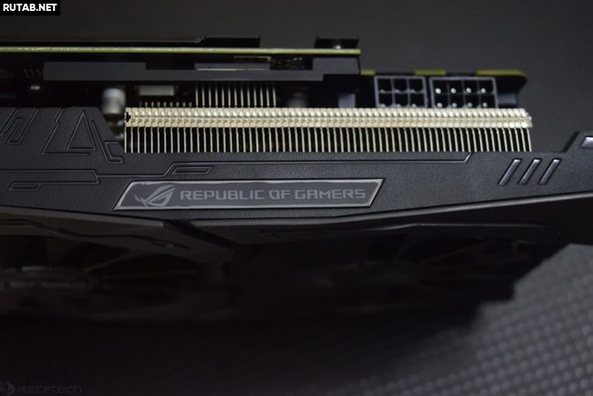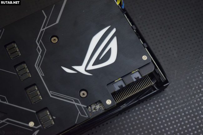 На обратной стороне карты мы видим очень хорошо выглядящую заднюю панель ROG STRIX, которая интегрирована с подсветкой ASUS Aura Sync.
