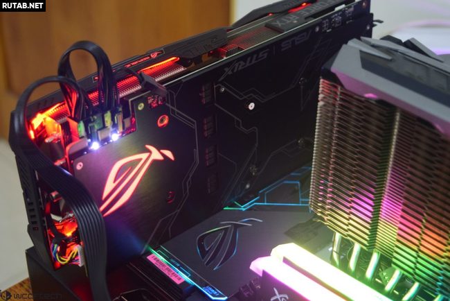 ↑Карты серии ASUS ROG STRIX используют технологию AURA SYNC RGB, чтобы предложить вам визуально приятное освещение на ваших видеокартах. Всего доступно 6 различных эффектов RGB, и у карт есть восемь точек акцента RGB: шесть на передней панели, одна на боковой стороне и одна на задней стороне карты, что выглядит действительно хорошо. Вы можете полностью настроить подсветку RGB по своему усмотрению, используя приложение ARUA Sync от ASUS.