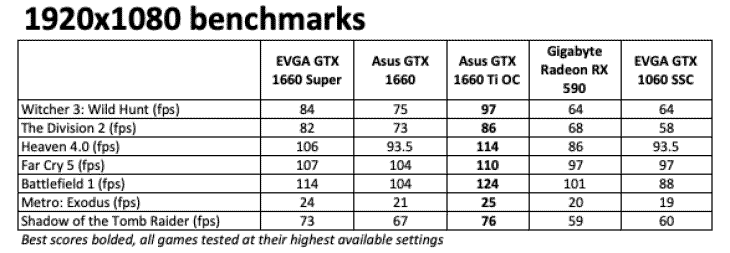 Для тестирования GTX 1660 Super использовался ПК IGN, состоящий из материнской платы MSI Z390, Intel Core i5-9600k, 16 ГБ оперативной памяти Corsair, твердотельного накопителя Sandisk и блока питания Corsair. Все тесты выполнены с максимальными настройками на разрешениях 1080 и 1440p без сглаживания. Список тестируемых видеокарт: EVGA GTX 1660 Super, Asus GTX 1660, Asus GTX 1660 Ti OC, Gigabyte Radeon RX 590, EVGA GTX 1060 SSC.