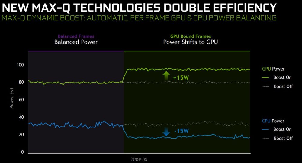 Также видеокарты получили технологию Dynamic Boost, которая балансирует нагрузку между CPU и GPU. Это позволяет увеличивать производительность игровых приложений, не повышая потребления энергии системой. Эта система активирована постоянно и работает в фоновом режиме.