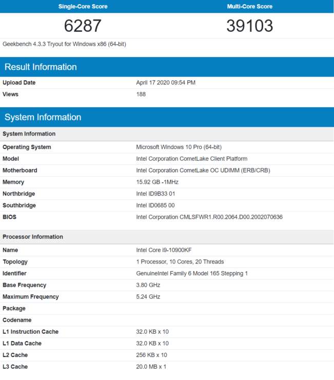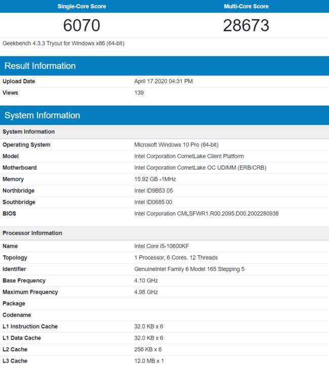 Результаты тестирования Intel Core i7-10700K и i5-10600K появились в Geekbench