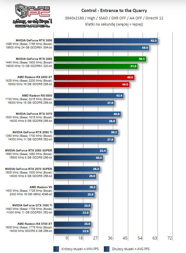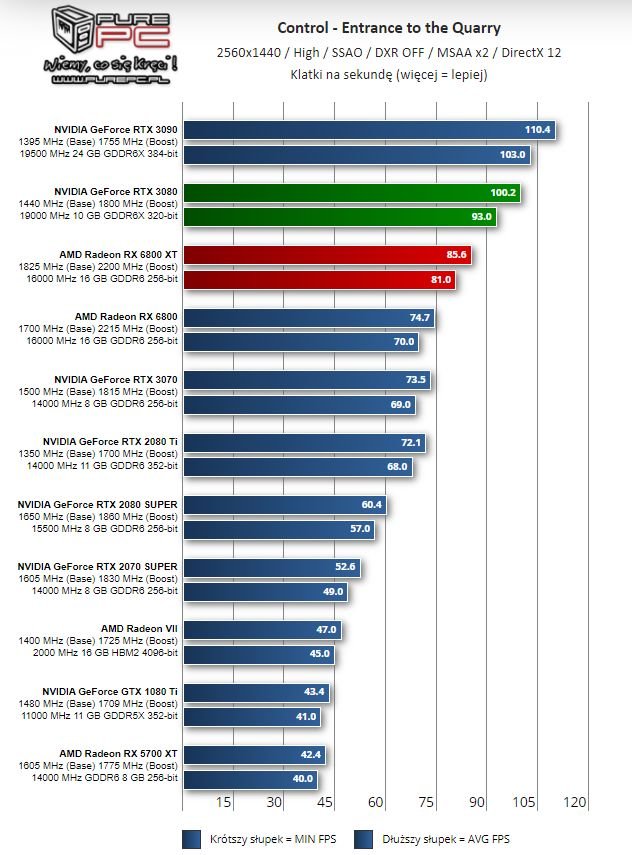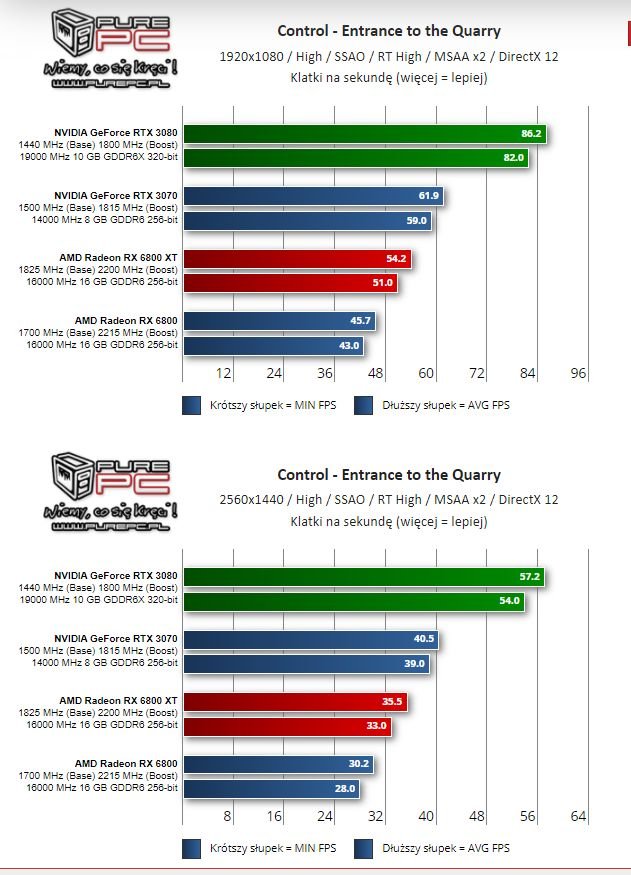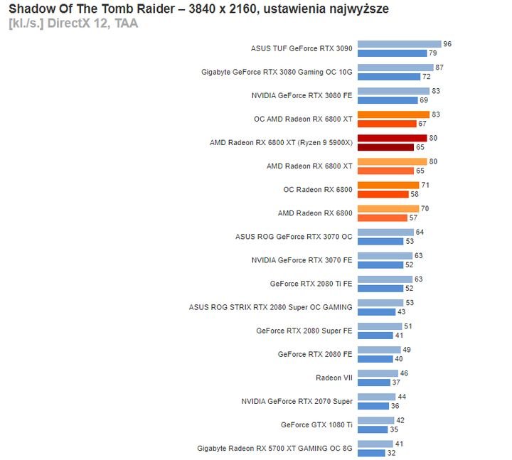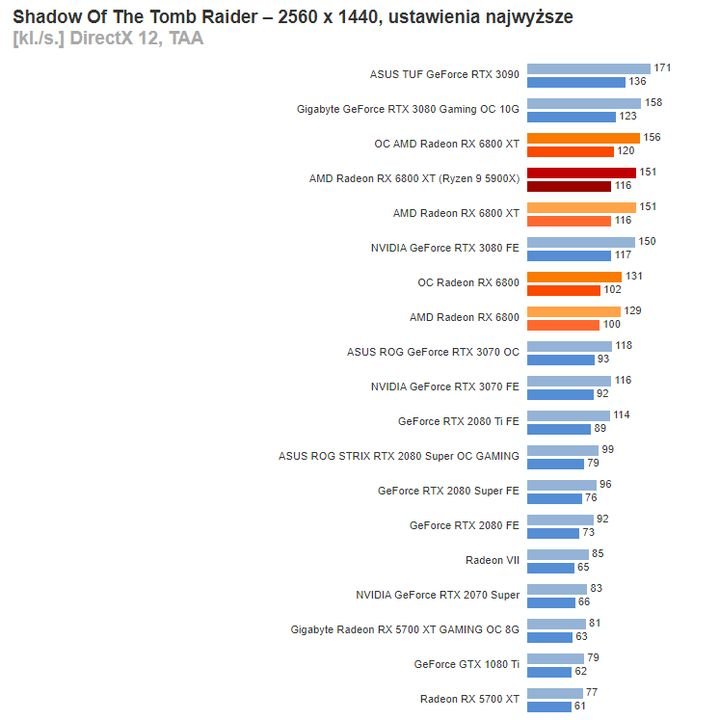 Традиционная производительность AMD Radeon RX 6800 XT работает очень хорошо, но из-за более узкой шины памяти (256 против 320 бит) аналог Ampere увеличивает свое преимущество с увеличением разрешения. В конце концов, между этими картами вплоть до 2560x1440 включительно среднее значение составляет около 5-6% в пользу зеленых. Стоит только отметить, что Radeon получила больше TMU и ROP, достигнув более высоких тактовых частот на ядре (~2200-2450 МГц), в то время как NVIDIA выделила часть кремния для ядер RT, CUDA и тензоров. [...] Если вы ищете видеокарту с трассировкой лучей, NVIDIA по-прежнему является лучшим вариантом, но в традиционном рендеринге конкуренция оказывается довольно равной. Преимущество Radeon RX 6800 XT - это, конечно, 16 ГБ памяти GDDR6, немного медленнее и с меньшей пропускной способностью, чем GeForce RTX 3080, но история показывает, что подача видеопамяти может продлить срок службы устройства - мы читаем в обзоре модели Radeon RX 6800 XT.