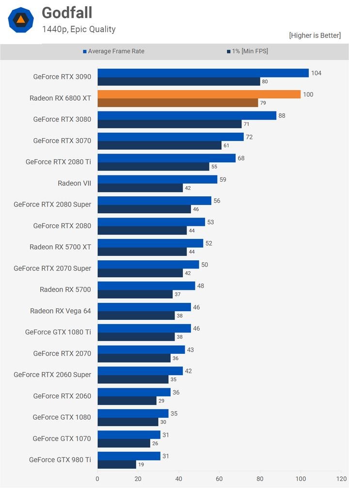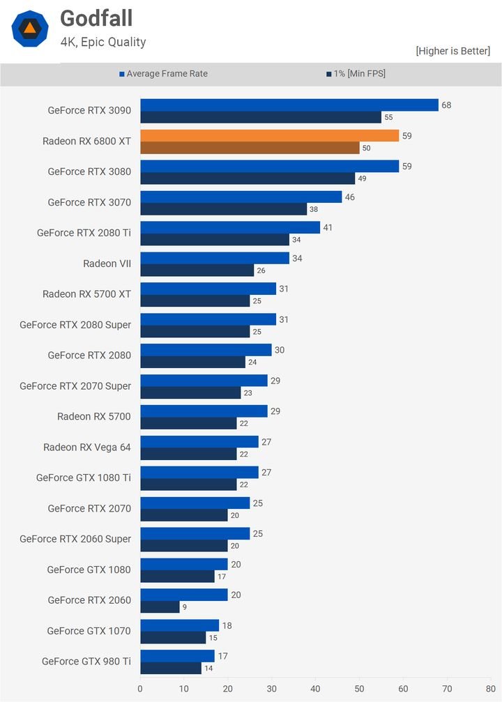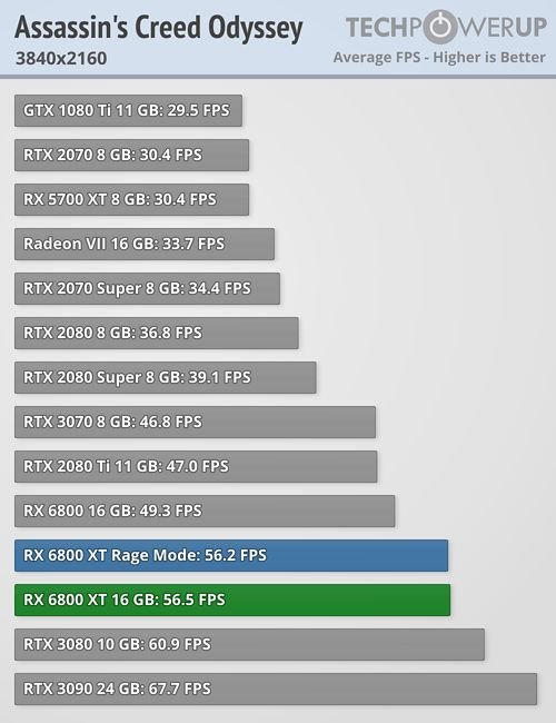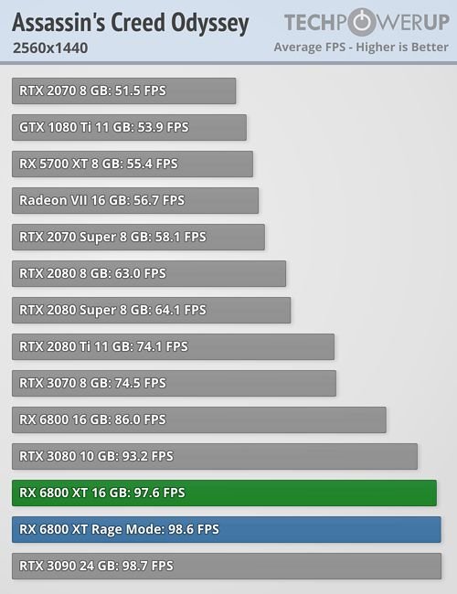 Radeon RX 6800 XT почти в два раза (!) быстрее, чем Radeon RX 5700 XT, довольно большая разница для одного поколения. Конечно, эти карты продаются по другим ценам, но это лучшее, что AMD могла предложить в то время. Мы также видим отличные результаты по сравнению с предложением Nvidia. RX 6800 XT только на 6% медленнее, чем RTX 3080, и на 25% быстрее, чем RTX 2080 Ti и RTX 3070. До анонса AMD я слышал, как люди говорили: "о, если бы только AMD могла сравниться с 2080 Ti, это было бы огромной победой для них". Самая быстрая модель Nvidia, RTX 3090, на 16% быстрее, чем RX 6800 XT, при значительно более высокой цене. И у AMD есть карта RX 6900 XT, подробности о которой мы узнаем в ближайшее время.