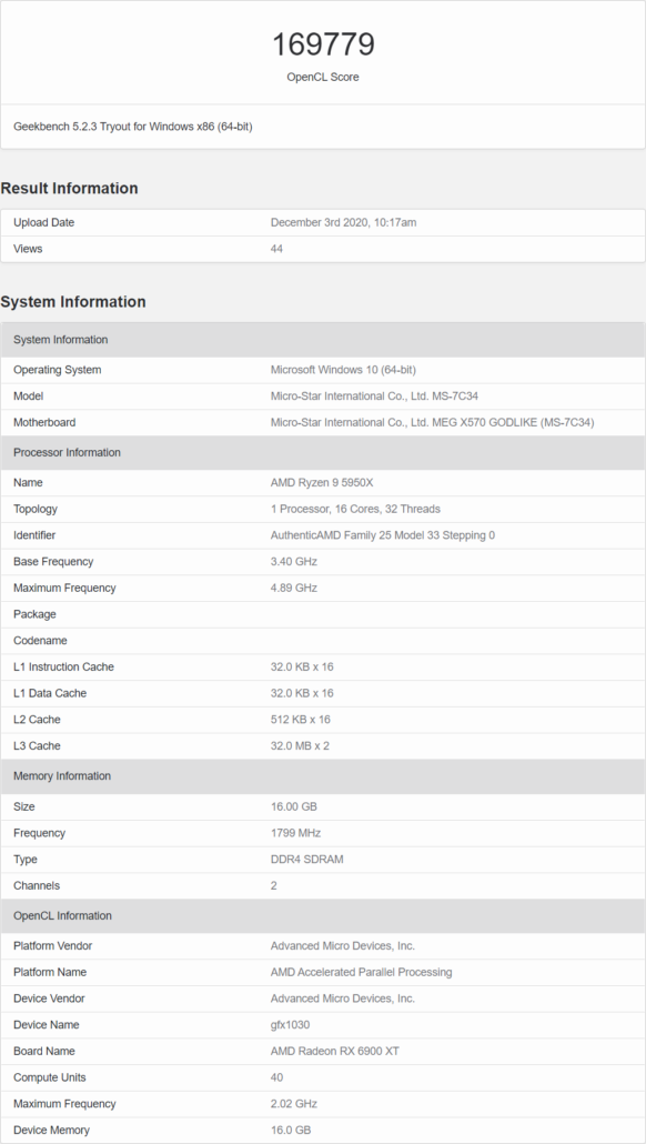 Тест был замечен TUM_APISAK и показывает производительность в тесте Geekbench 5 OpenCL. AMD Radeon RX 6900 XT набрала максимум 169 779 баллов при работе на платформе X570 с Ryzen 9 5950X. На самом деле невозможно определить, была ли включена технология Smart Access Memory для этого теста, но в случае её отключения мы увидим более высокую производительность.
