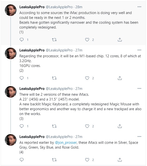 Наконец, LeaksApplePro утверждает, что новые модели iMac будут доступны в цветах Silver, Space Grey, Green, Sky Blue и Rose Gold. Это та же информация, о которой ранее говорил другой инсайдер Джон Проссер.