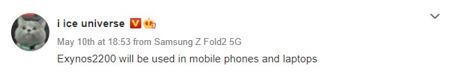Ice Universe на Weibo считает, что первым чипсетом Exynos от Samsung, который будет использоваться как для смартфонов, так и для ноутбуков, станет Exynos 2200. К сожалению, никаких конкретных подробностей предоставлено не было, хотя некоторое время назад инсайдер упоминал, что чип может быть представлен в июне 2021 года.