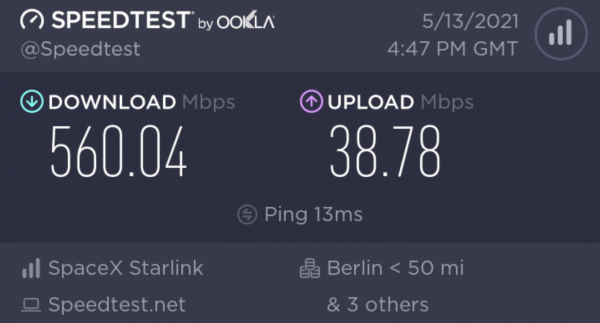 Новым достижением Starlink стала скорость загрузки в 560 Мбит/с. Вместе с тем индикаторы отправки данных были значительно скромнее: 38,78 Мбит/с при пинге в 13 мс. При повторном запуске Speedtest после очистки кеша итоги тестирования составили 529,31 и 38,8 Мбит/с соответственно, а значение задержки снизилось до 10 мс.