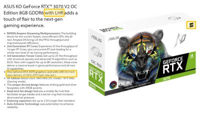 Компания ASUS максимально точно следовала рекомендациям NVIDIA, поскольку они не только добавили тег LHR на страницу продукта, но и добавили его на упаковку.