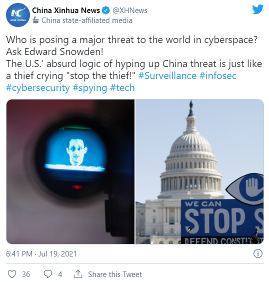 В комментарии «Синьхуа» упоминается аналитик ЦРУ Эдвард Сноуден, который в 2013 году заявил, что, по его мнению, Агентство национальной безопасности США провело более 61 000 хакерских операций по всему миру, в том числе многие в Китае. В 2014 году The New York Times сообщила, что документы Сноудена показали, что АНБ взломало серверы китайского телекоммуникационного гиганта Huawei.