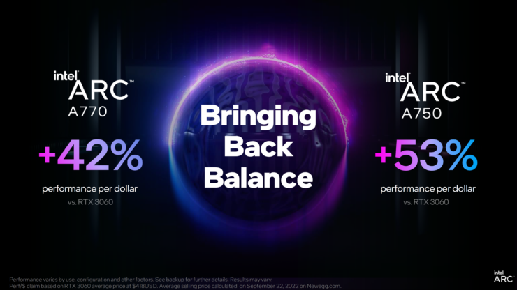 Этот графический процессор будет нацелен на возможности мобильности серии GeForce RTX 3060. Intel показала, что карта в среднем на 5% быстрее, чем RTX 3060, в 48 современных играх. Intel также заявляет, что Arc A750 предлагает до 53% более высокую производительность за доллар по сравнению с той же разогнанной RTX 3060 или на 11% выше, чем у Arc A770, что очень впечатляет. Это хорошее предзнаменование для карты, учитывая, что ни NVIDIA, ни AMD не планируют выпускать массовые и бюджетные карты на основе своих архитектур графических процессоров следующего поколения в течение еще пары месяцев.
