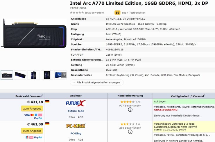 В Германии магазины начали продавать видеокарты Intel Arc A770 Limited Edition