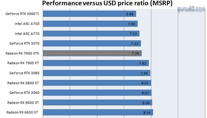 Соотношение цены и качества AMD Radeon RX 7900 XTX. Источник: Guru3D.