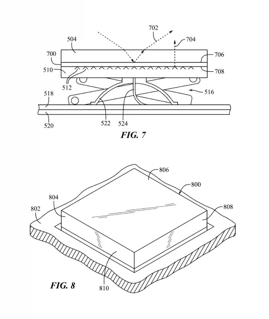 Заявка Apple также включает в себя несколько изображений, показывающих макеты того, как эта технология может работать. В патентной заявке поясняется, что с помощью этой конструкции колпачки клавиш клавиатуры могут быть изготовлены из материалов, которые обычно не используются в колпачках для обычных клавиатур, таких как металлы, включая алюминий.