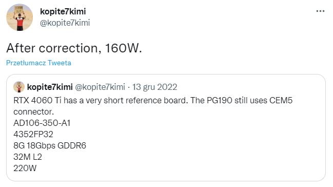 По его словам, RTX 4060 Ti должен работать с TDP 160 Вт. Это означает, что новое предложение от Nvidia будет более энергоэффективным, чем его предшественник RTX 3060 Ti.