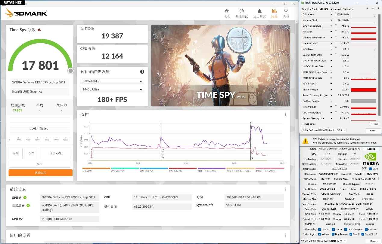 Мобильный чип NVIDIA GeForce RTX 4090 был использован на машине Zero Thunderobot, протестированной MyDrivers, и во время тестов он может развивать мощность до 170 Вт, при этом поддерживая температуру ядра графического процессора ниже 80°C во время тестов. Память работает при чуть более высокой температуре 85°C, но она все еще значительно ниже своего теплового порога.