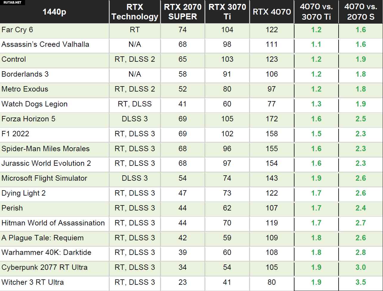 Производительность NVIDIA GeForce RTX 4070 1440P: