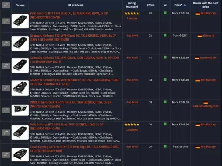 В новом отчете о падении цен на графический процессор NVIDIA GeForce RTX 4070 выясняется, что на немецком рынке стоимость видеокарты опустилась ниже отметки в 600 евро. Напомним, что видеокарта доступна для покупки всего несколько недель. Причина повышенного снижения стоимости заключается в том, что потребители по-прежнему неохотно покупают новую видеокарту.