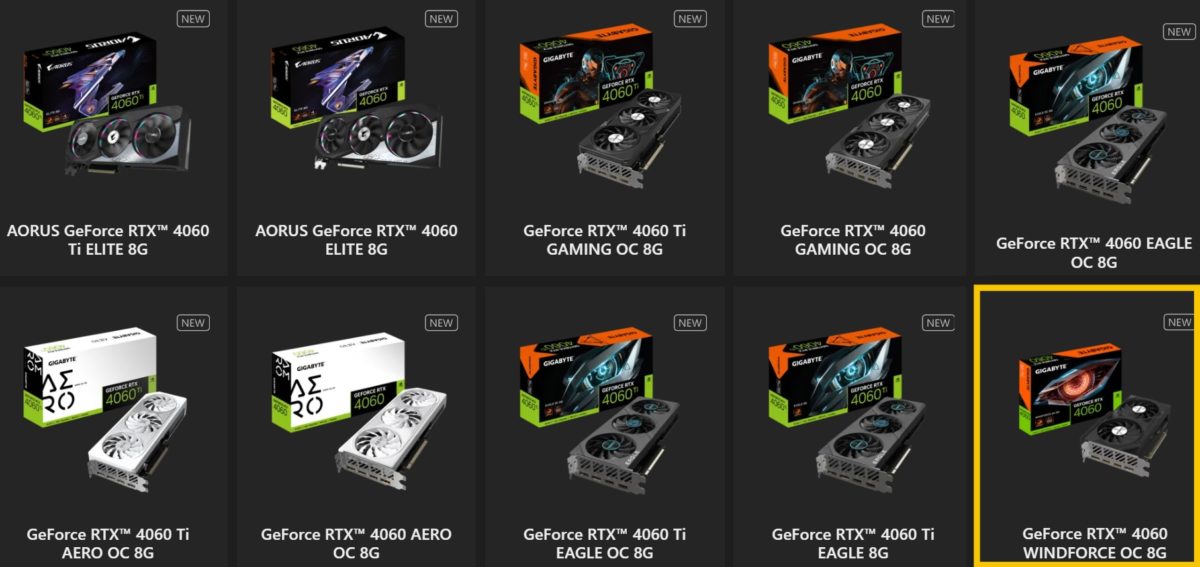 К счастью, Gigabyte наконец-то решила воспользоваться низким TDP серии RTX 4060. RTX 4060 WindForce OC — это первая нестандартная разработка компании для серии Ada Lovelace с двумя вентиляторами. Все анонсированные вчера карты RTX 4060 изображены ниже:
