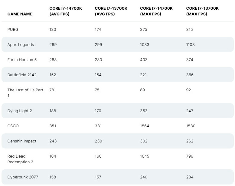 Производительность в играх также была лучше, чем у Core i7-13700K, за исключением нескольких случаев, когда Intel Core i7-14700K работал хуже, чем его предшественник из-за плохой настройки на уровне прошивки и тактовых частот ES. Результаты собраны в следующей таблице: