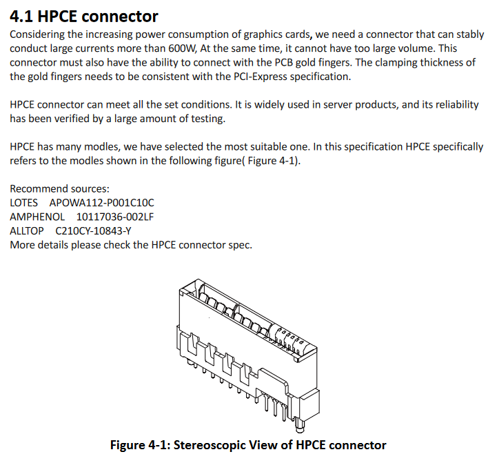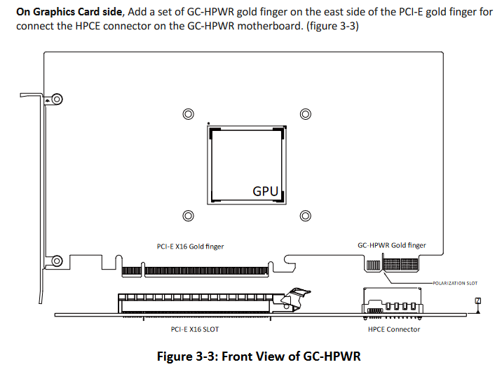 Разъем GC-HPWR имеет четыре различные группы контактов, отвечающих за подачу питания и связь между материнской платой и графическим процессором. Он будет расположен рядом со слотом PCIe x16, что упростит процесс установки, который поддерживается самим слотом PCIe. Новые разъемы пришли из серверной индустрии и модифицированы таким образом, чтобы поддерживать подачу питания, необходимую для графических процессоров текущего поколения.