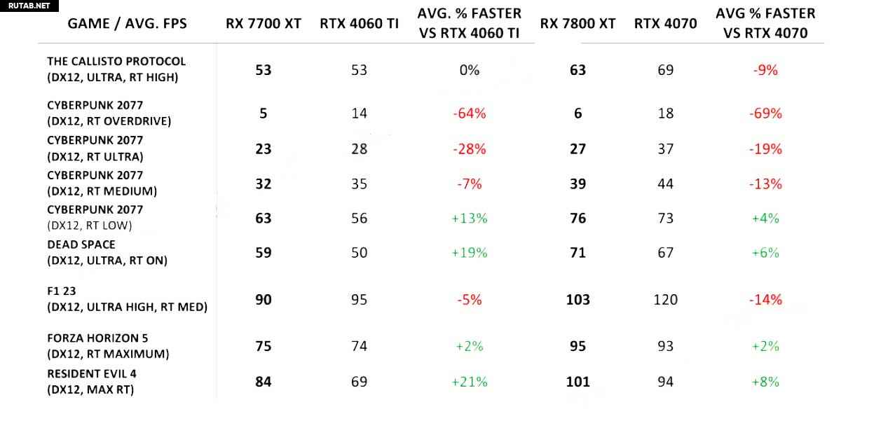 При включенной трассировке лучей AMD Radeon RX 7800 XT на 55% медленнее, чем RTX 4070. Особенно сильно карта отстала в Cyberpunk 2077, где производительность упала на -69%. RX 7700 XT оказалась на 5,4% медленнее, чем RTX 4060 Ti 16 ГБ. Подводя итоги:
