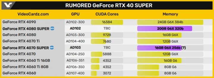 Недавно в сети появились слухи о новых видеокартах SUPER серии RTX 40 от Nvidia. Потенциальная GeForce RTX 4070 SUPER получит 16 ГБ видеопамяти и 256-битную шину. Между тем RTX 4080 SUPER может получить 20 ГБ видеопамяти. Больше памяти также означает более широкую 320-битную шину.