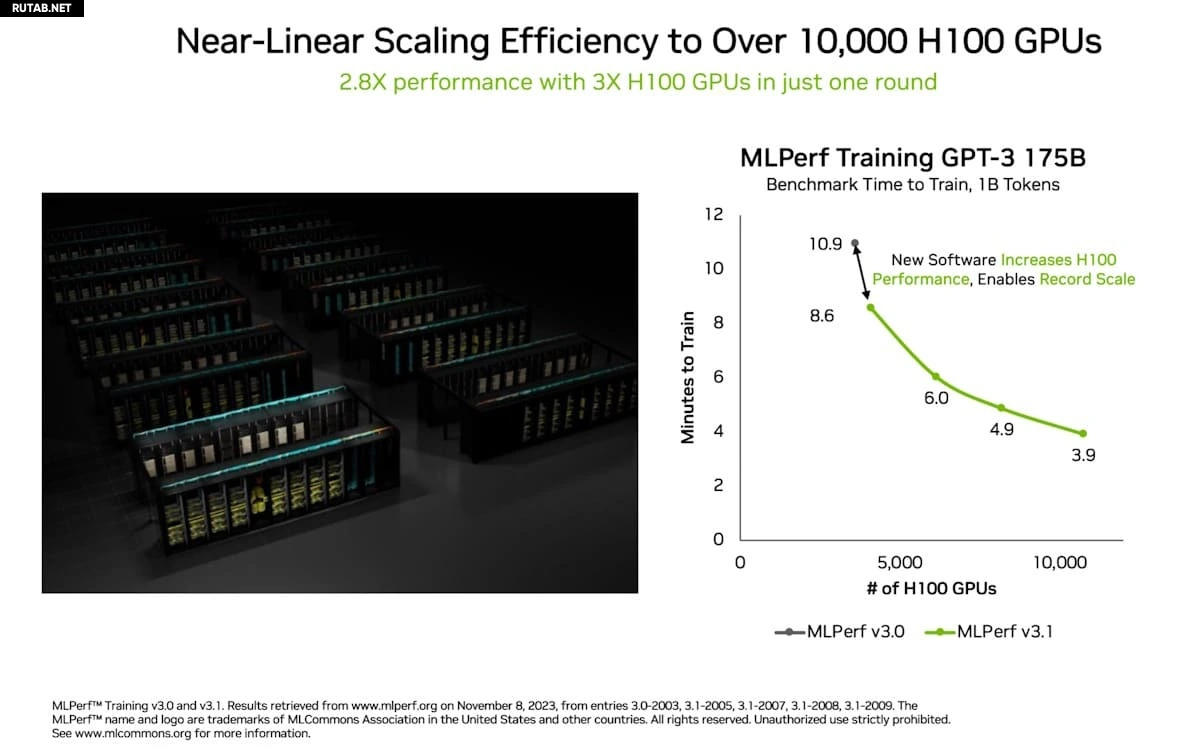 Более того, еще одним рекордным достижением NVIDIA, упомянутым в посте, являются достижения в области «масштабирования системы», где с помощью различных оптимизаций программного обеспечения компании удалось добиться эффективности на уровне 93%. 10 752 графических процессора H100 намного превзошли масштабирование в обучении искусственного интеллекта в июне, когда NVIDIA использовала 3 584 графических процессора Hopper. Важность эффективного масштабирования в отрасли огромна, поскольку достижение высокой вычислительной мощности требует использования большего количества аппаратных ресурсов, а без адекватного программного обеспечения эффективность системы снижается в большей степени.