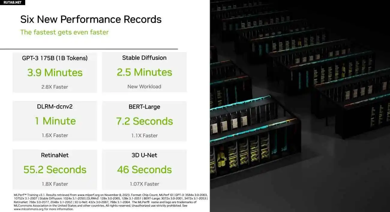 В свежих тестах MLPerf, опубликованных NVIDIA, компания подчеркивает, что они установили несколько новых рекордов: суперкомпьютер Eos завершил обучающий тест на основе модели GPT-3 со 175 миллиардами параметров, обученных на одном миллиарде токенов всего за 3,9 минуты. Это огромный прирост по сравнению с предыдущим рекордом, когда суперкомпьютеру удалось выполнить тот же тест за 10,9 минуты, что означает колоссальный рост в 3 раза.