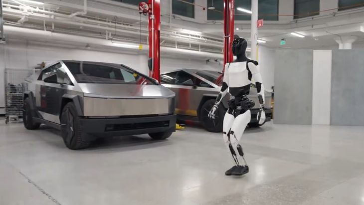 Видео также показывает, как бот проходит по заводу Tesla, рядом с припаркованными Cybertruck, и выполняет приседания в тренажерном зале.