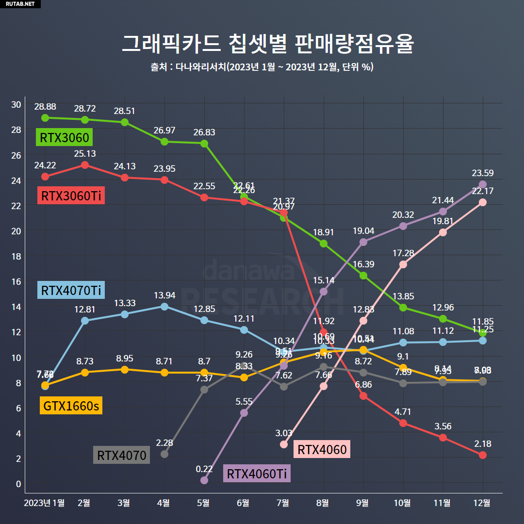 По данным Danawa Research, графические процессоры NVIDIA GeForce RTX 4060 сейчас пользуются гораздо большим успехом у покупателей: общий объем продаж этих карт превышает 40%. RTX 4060 Ti является самым популярным графическим процессором с долей продаж 23,59%, за ней следует RTX 4060 с долей продаж 22,17%. Между тем, доля RTX 3060, предыдущего самого популярного графического процессора, упала до 11,85%, а доля RTX 3060 Ti упала до 2,18% от объема продаж, зарегистрированных в декабре 2023 года. Распределение долей продаж за декабрь 2023 года выглядит следующим образом:
