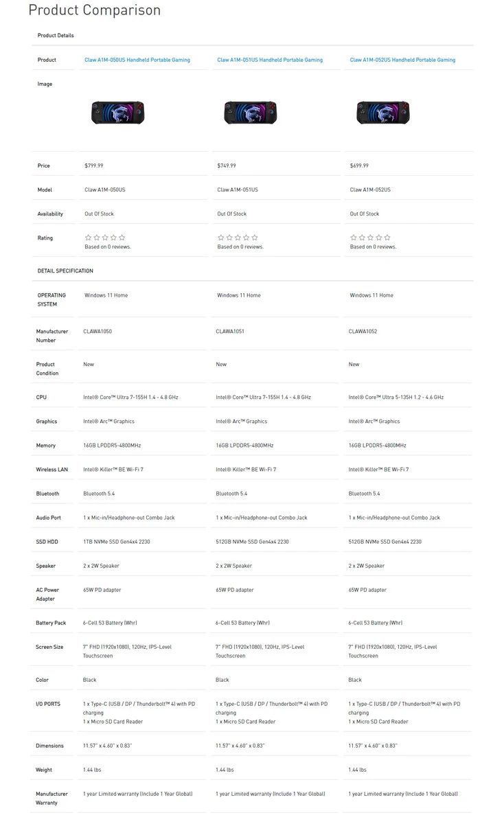 Есть вариант посередине этих двух — MSI Claw A1M-051US. Он оснащен тем же процессором Intel Core Ultra 7 155H, что и самая дорогая модель, но с твердотельным накопителем емкостью 512 ГБ. Все варианты будут поставляться с 16 ГБ оперативной памяти LPDDR5 , а все остальные характеристики будут одинаковыми. Вы можете узнать больше из изображения ниже, сравнив три варианта.
