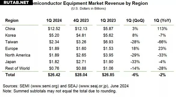 По данным SEMI, выручка от реализации оборудования для выпуска чипов в I квартале сократилась на 2% до $26,4 млрд в годовом сравнении и на 6% — в последовательном. Китайские производители чипов удвоили закупки этого оборудования, и теперь на их долю приходится 47% мировых затрат.