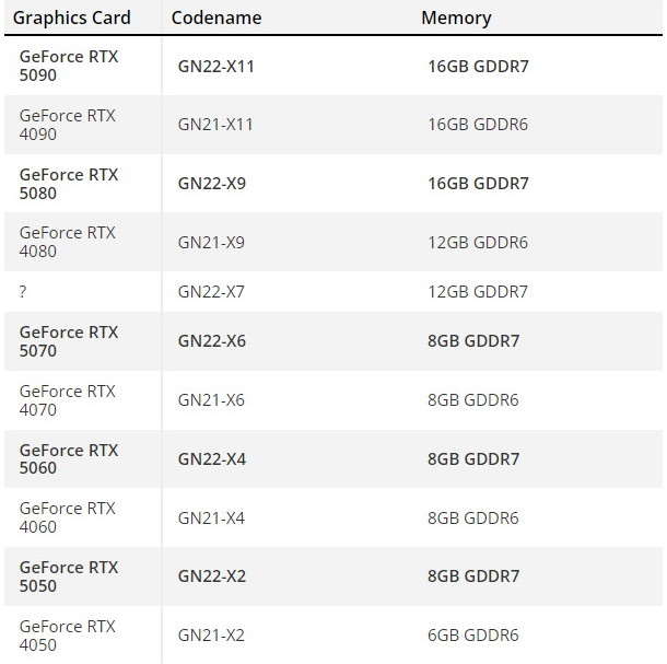 GN22-X11 и GN22-X9 должны заменить GeForce RTX 4090 (GN21-X11) и GeForce RTX 4080 (GN21-X9) соответственно. Если исходить из кодовых названий, мы потенциально рассматриваем GeForce RTX 5090 и GeForce RTX 5080. Однако есть также упоминание о GN22-X7 с 12 ГБ GDDR7, которая могла бы быть GeForce RTX 5080, если предположить, что Nvidia сохранит конфигурация 12 ГБ для GeForce RTX 5080.