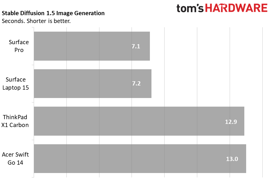 Благодаря Stable Diffusion 1.5 Surface Pro и Surface Laptop 15 потребовалось всего 7,1 и 7,2 секунды соответственно, чтобы нарисовать изображение кошки за рулем автомобиля (моя обычная подсказка). Два протестированных нами ноутбука с процессором Intel Core Ultra 7 — ThinkPad X1 Carbon (Gen 12) и Acer Swift Go 14 — выполнили ту же задачу за 12,9 и 13 секунд.