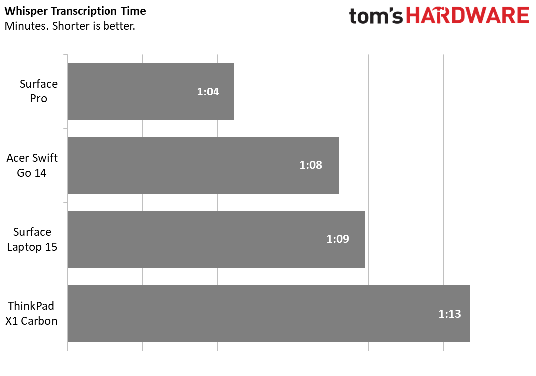 На Whisper результаты оказались неоднозначными. Если мы посмотрим только на время, которое потребовалось нашему сценарию Python для расшифровки аудиофайла, ноутбуки Snapdragon работали примерно с той же скоростью, что и их конкуренты Intel, плюс-минус несколько секунд на каждой модели, а время завершения варьировалось от 1:04. на Surface Pro с процессором Snapdragon X до 1:13 на X1 Carbon с процессором Core Ultra 7. В целом ноутбуки Snapdragon были на несколько секунд быстрее, но Surface Laptop 15 потребовалось 1:09, а Acer Swift Go 14 (Core Ultra 7) финишировал за 1:08.