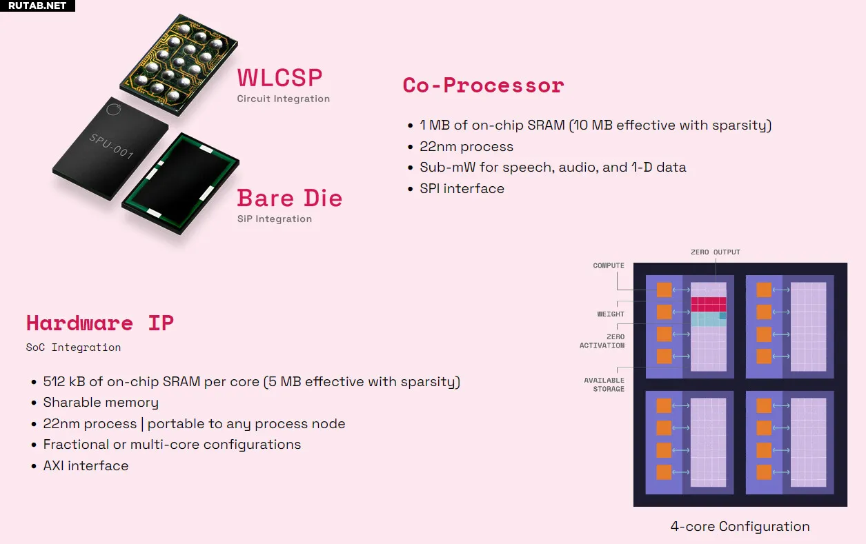 AI-ADAM-100 включает в себя Femtosense Sparse Processing Unit 001 (SPU-001), нейронный процессор (NPU) и полупроводниковый микроконтроллер ABOV для обеспечения глубокого обучения обработки голоса AI и возможности очистки голоса на устройстве на край. Благодаря языковой обработке устройства могут реализовывать голосовые интерфейсы «скажи, что ты имеешь в виду», которые позволяют пользователям говорить естественно и свободно выражать свои намерения разными способами. Например, «Выключите свет», «Выключите свет» и «Выключите свет» передают одно и то же намерение и понимаются как таковые.