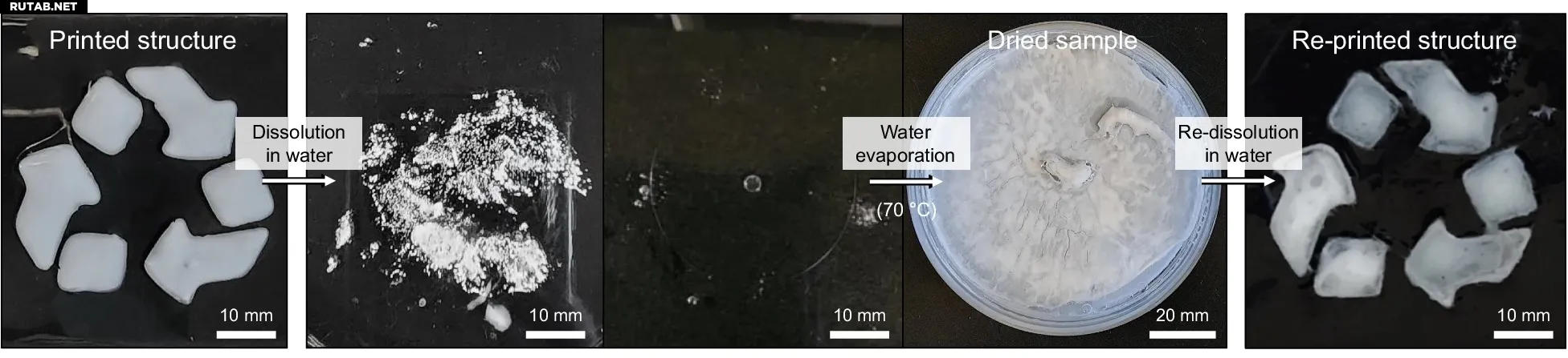 Команда использовала этот метод для создания электрической цепи, смешанной с углеродными нанотрубками, которая затем питала небольшую лампочку. Переработка материала осуществлялась путем растворения структур в пресной воде, а затем испарения воды в печи при температуре 158º F (70º C).