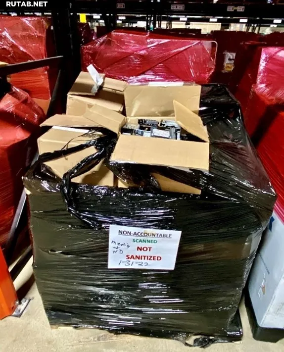 Поддон с открытой (или сломанной) упаковкой на стеллажах объекта, обнажающий электронные носители информации (Изображение предоставлено Управлением генерального инспектора США)