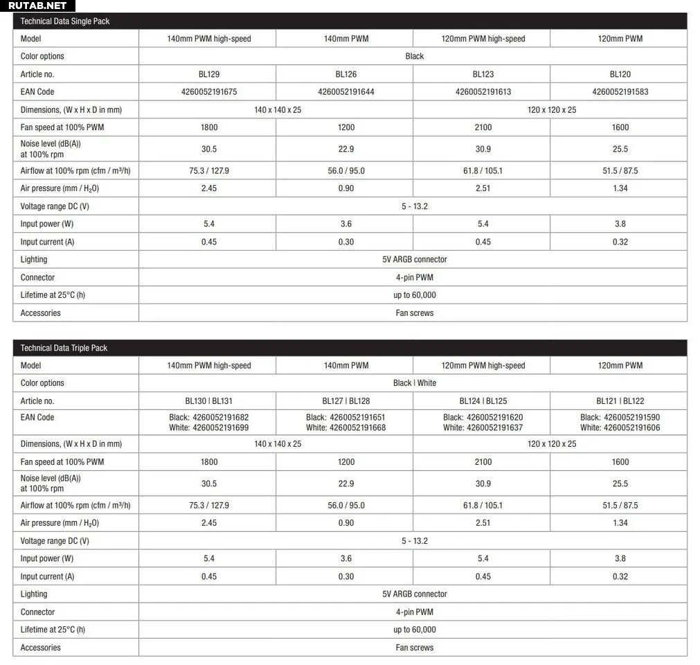 Light Wings LX доступен в черном и белом цветах в тройных упаковках, а черные модели также доступны в виде отдельных вентиляторов. Во всех моделях используется высококачественная технология подшипников с винтовой нарезкой, которая обеспечивает очень долгий срок службы до 60 000 часов. Включена полная 3-летняя гарантия производителя.