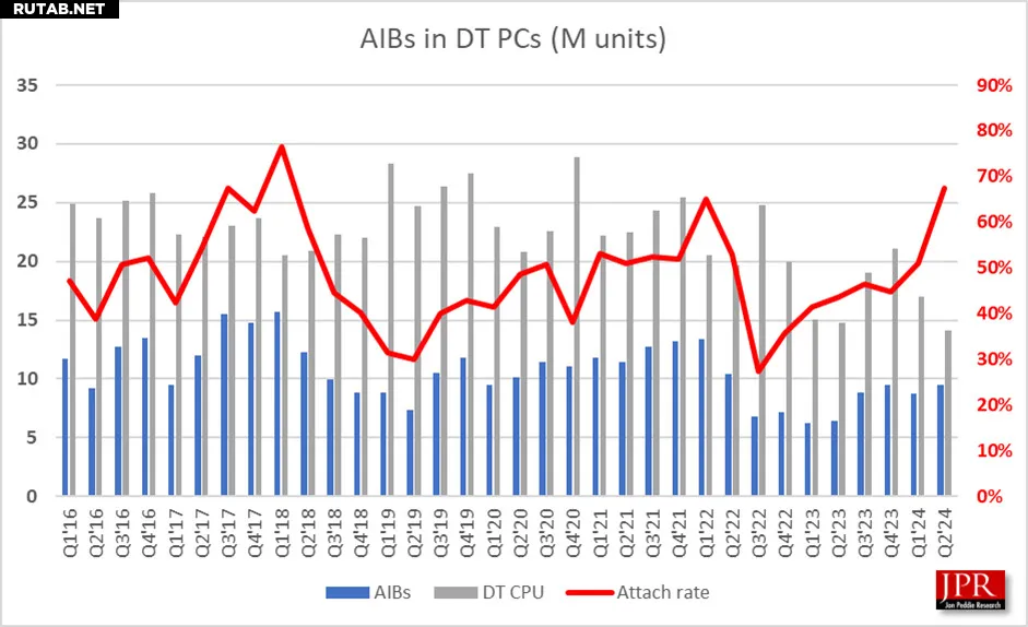 C. Robert Dow, аналитик Jon Peddie Research, добавил: «Увеличение поставок во втором квартале противоречит обычной сезонности; всплеск можно объяснить выпуском новых AIB в первом квартале и небольшим падением цен на рынке в целом. Цены должны оставаться неизменными до тех пор, пока AIB следующего поколения не будут выпущены в конце 2024 или в 2025 году».