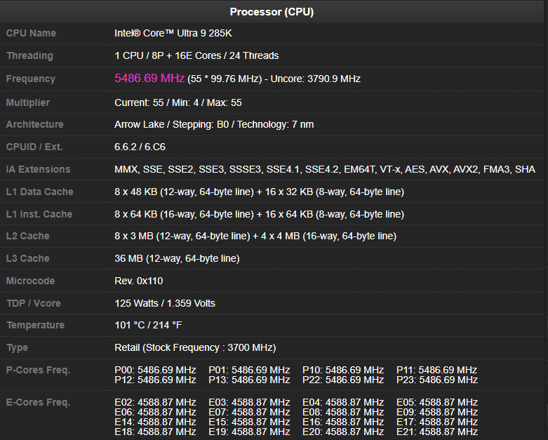 По иронии судьбы, CPU-Z указывает, что этот CPU изготовлен с использованием "7-нм" процесса. Однако на самом деле Compute Tile использует узел N3B (3 нм) от TSMC. Так или иначе, здесь 285K работает на частоте 5,5 ГГц и 4,6 ГГц на всех P-ядрах и E-ядрах соответственно. Статистика проверки показывает, что CPU работает при 100 градусах Цельсия, поэтому не воспринимайте этот тест как показатель окончательной производительности.