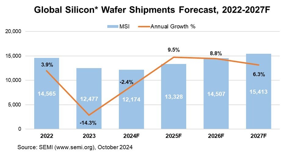 Ожидается, что сильный рост поставок кремниевых пластин продолжится до 2027 года, чтобы удовлетворить растущий спрос, связанный с ИИ и передовой обработкой, что приведет к повышению коэффициента использования производственных мощностей для мирового производства полупроводников. Более того, новые приложения в области усовершенствованной упаковки и производства памяти с высокой пропускной способностью (HBM), для которых требуются дополнительные пластины, способствуют росту потребности в кремниевых пластинах. К таким приложениям относятся временные или постоянные несущие пластины, интерпозеры, разделение устройств на чиплеты и разделение массивов памяти и логики.