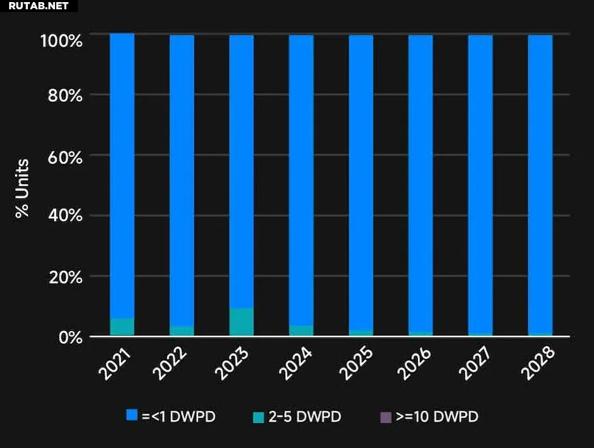 Согласно последнему исследованию FI (Forward Insight), до 91% текущих развертываний PCIe SSD используются в приложениях с DWPD менее 1, и ожидается, что к 2028 году эта доля достигнет 99%. Этот сдвиг подчеркивает растущую распространенность приложений с интенсивным чтением и центров обработки данных, где SSD QLC преуспевают.