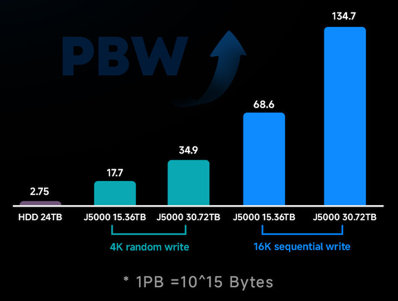 DapuStor QLC SSD J5000 значительно превосходит традиционные HDD по выносливости. В сценариях последовательной записи больших блоков данных 32 ТБ QLC SSD, если записывать его на полную мощность один раз в день, потребуется более 11,5 лет, чтобы достичь своей выносливости.