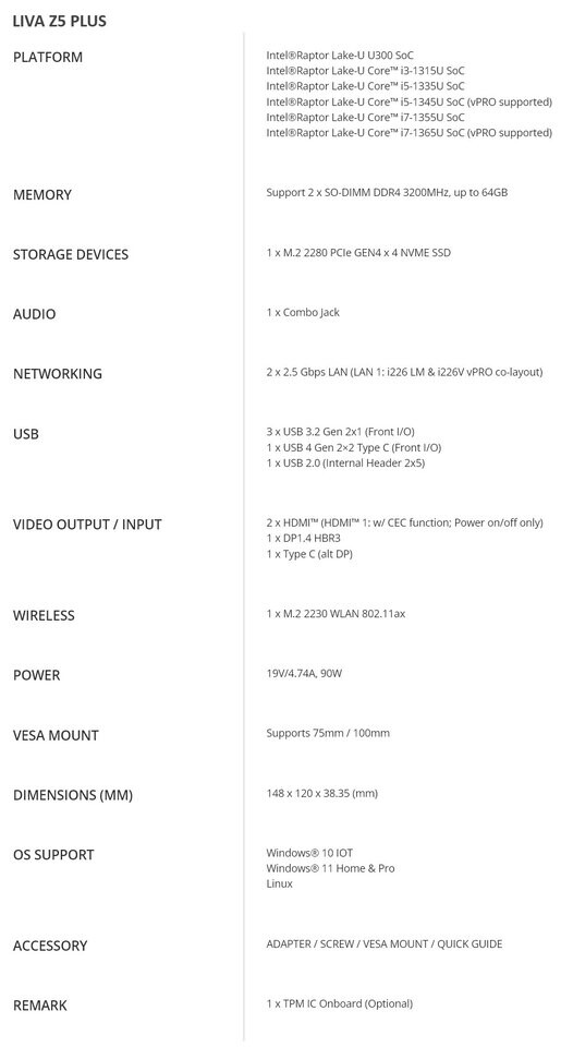 LIVA Z5 PLUS работает на процессорах Intel 13-го и 14-го поколения Core, предлагая расширяемую память и хранилище для исключительной производительности вычислений. Он предоставляет универсальные возможности подключения для удовлетворения различных потребностей, включая два порта HDMI, один DisplayPort и четыре порта USB. Улучшенная производительность сети обеспечивается двумя портами 2,5GbE и WLAN6, обеспечивающими многогигабитные скорости для бесшовного, бесперебойного подключения.
