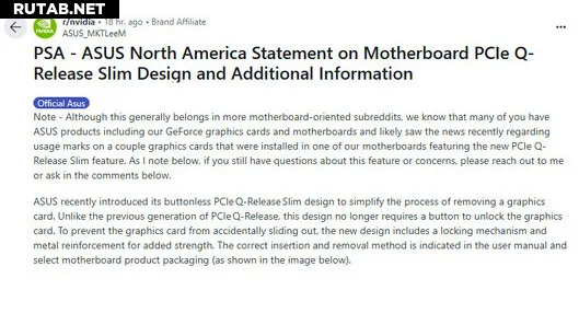 Примерно восемнадцать часов назад аккаунт "ASUS_MKTLeeM" опубликовал длинное и весьма подробное публичное объявление (PSA) на сабреддите NVIDIA. Представитель ASUS USA заявил: "мы знаем, что у многих из вас есть продукты ASUS, включая наши видеокарты GeForce и материнские платы, и, вероятно, недавно видели новости о следах использования на паре видеокарт, которые были установлены в одну из наших материнских плат с новой функцией PCIe Q-Release Slim". Они отметили, что будут рады отзывам пользователей на Reddit — через комментарии или личные сообщения. Мессенджер компании указал, что сообщенные проблемы возникли из-за уникальных пользовательских случаев — профессиональным обозревателям (дорогих видеокарт) не понравится читать этот ответ: "в ходе нашего внутреннего тестирования и оценки чрезвычайно небольшого числа сообщенных случаев мы не обнаружили никаких повреждений материнской платы или видеокарты, которые могли бы повлиять на функциональность и/или производительность... Однако важно подчеркнуть, что любой тип карты расширения PCIe получит следы использования и следы износа после 60 непрерывных вставок и извлечений".