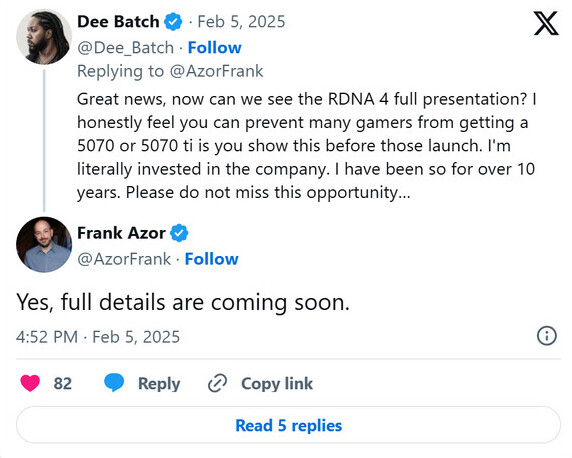 После публикации последних утечек, связанных с RDNA 4, один храбрец связался с Фрэнком Азором из AMD в социальных сетях. Ди Батч, верный и давний сторонник игрового оборудования Radeon, отправил запрос главному архитектору игровых решений Team Red: «можем ли мы увидеть полную презентацию RDNA 4? Я искренне считаю, что вы можете помешать многим геймерам приобрести графический процессор GeForce RTX 5070 или RTX 5070 Ti... Пожалуйста, не упустите эту возможность завоевать доверие геймеров». Азор ответил коротким предложением: «да, скоро появятся полные подробности». Это краткое взаимодействие привлекло дополнительных участников — VideoCardz отметил, что руководитель Team Red принимает во внимание отзывы об ожиданиях, связанных с рекомендованными розничными ценами RDNA 4. В конце прошлого месяца Азор опроверг слухи о том, что цены на Radeon RX 9070 XT начинаются с базовой цены в 899 долларов. NVIDIA официально раскрыла ценовые ориентиры в 549 долларов (RTX 5070) и 749 долларов (RTX 5070 Ti) — энтузиасты AMD скрещивают пальцы в надежде на конкурентоспособные цифры, которые будут объявлены позже.