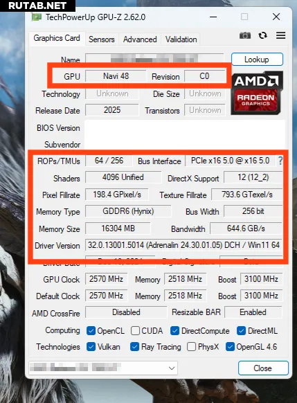 Интерфейс памяти Radeon RX 9070 XT на 256 бит поддерживает восемь модулей VRAM, обеспечивая пропускную способность 644 ГБ/с, что эквивалентно 20 Гбит/с микросхемам GDDR6, что не лучше, чем у предыдущего поколения. Рассматриваемый графический процессор, вероятно, кастомная модель, рассчитан на тактовую частоту 3,1 ГГц, что должно обеспечить приличный прирост производительности по сравнению с RDNA 3.